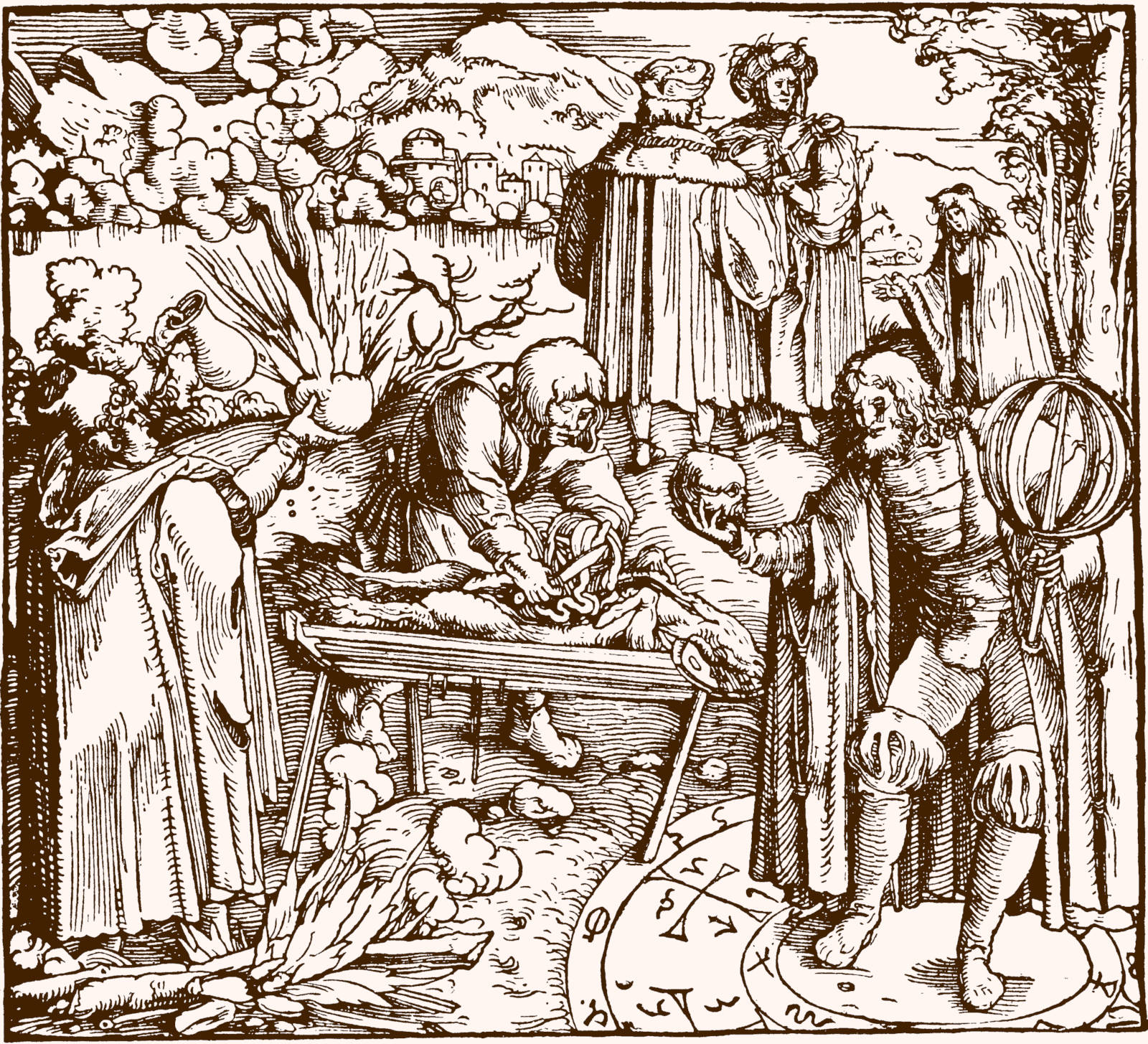 Ärzte: tragen den Doktorhut in Form eines kleinen Baretts, Mäntel mit Armschlitzen, oft mit Pelzkragen. Ihre Tracht kennzeichnet sie als Gelehrte und Bürger (siehe Bilder 1.4 und 2.3). Von den Ärzten werden die Bader unterschieden, die ohne Barett und Mantel auftreten und z.B. als Chirurgen arbeiten (Bild 2.96).