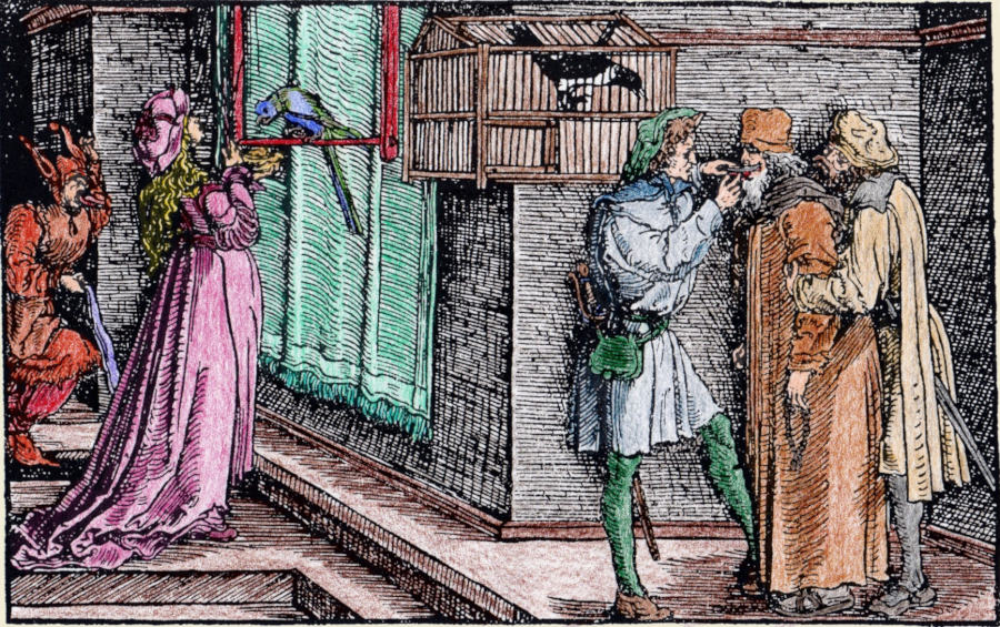 Soweit schreibt Walther Scheidig. Aus geistiger Sicht könnte man rechts das Ichbewußtsein bzw. Ego mit der Geldtasche und dem Schwert der Trennung in seinem Körperhaus sehen, das der Vernunft mit seinem „begrifflichen Helfer“ des Verstandes die Zunge abschneidet, um sie nicht mehr hören zu müssen. Entsprechend wird das Bewußtsein in den Käfig des begrifflichen Verstandes eingesperrt und kann sich nicht mehr erheben, wie die Elster in ihrem Käfig. Auf der linken Seite könnte man noch eine Ebene niedriger das Körperbewußtsein der weiblichen Natur sehen, in das sich der männliche Geist „vernarrt“ hat, so daß nun der naturgebundene Geist in seinem Stolz „mit Zuckerbrot und Peitsche“ versucht, das tierhafte Körperbewußtsein wie einen Papagei zu erziehen, um mit ihm sprechen zu können. Ähnlich meinen auch heute noch viele Naturwissenschaftler, daß die Materie im Laufe der Natur-Evolution das menschliche Sprechen gelernt hat, Verstand ausbildet und manchmal sogar Vernunft. Entsprechend arbeiten wir heute auch daran, daß nicht nur Tiere wie Menschen sprechen, sondern auch Maschinen, um uns mit ihnen zu unterhalten. Soweit ist unser menschliches Bewußtsein bereits gesunken…